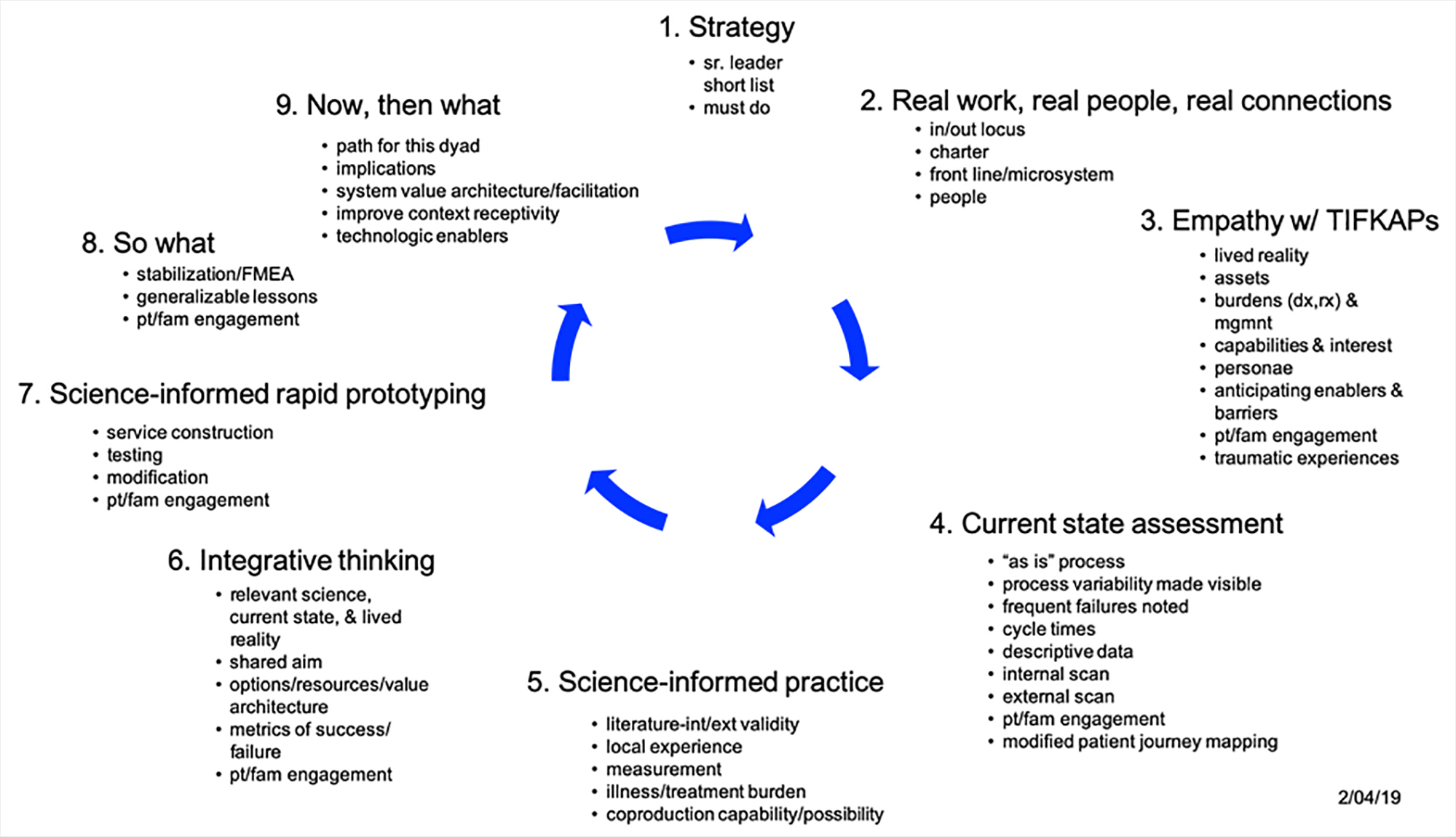 To facilitate our work, we created a learning plan jpg, 508.1 kB. for our time together. We began by identifying, clarifying the strategically important areas in the organizations. We connected the “front line” work microsystems where the people sometimes known as professionals and the people sometimes known as “patients” connected. We sought to develop an empathic understanding of “The Individuals Formerly Known As Patients” (TIFKAP). We developed “personae” that helped the subpopulation of TIFKAPs come alive. We explored the current state of the system that needed to be navigated in the experience of patients and families as they sought help. Then we turned our attention to how our empathic understanding of those sometimes known as patients, our insights into the current state of the system needing navigation, and the literature of the science-informed practices that were relevant. This integrative step involved bridging the different ways in which these knowledge domains were developed & used. Subsequently (as well as along the way) we created prototypes of change which could be tested. We assessed what had been learned, what might need to be done to use these insights throughout the organizations involved.
