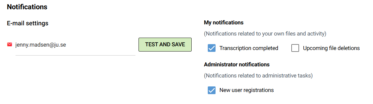 Vill du få e-post aviseringar när din transkribering/undertextning är klar eller bli påmind om när dina filer närmar sig datum för radering, måste du gå själv gå till "User settings" inne i tjänsten, fylla i din e-postadress och kryssa i rutorna för att aktivera dessa.