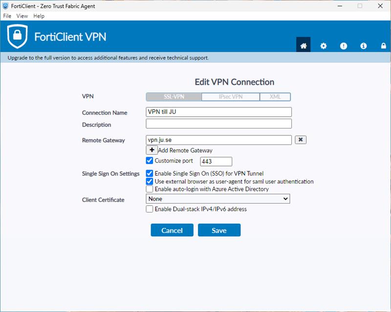 På en privat dator, behöver den fria varianten av FortiClient VPN installeras. Följ stegen nedan.