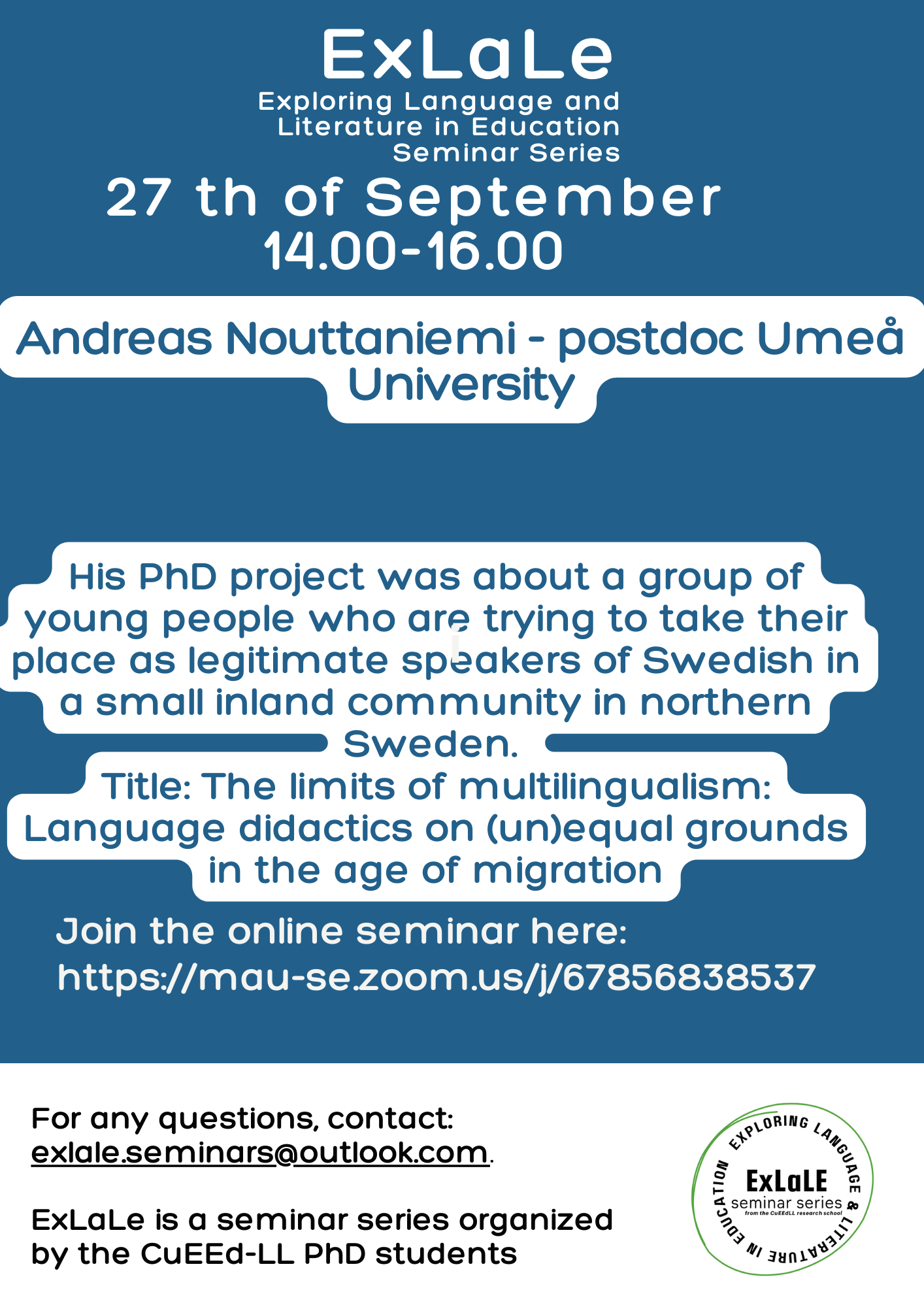 Welcome everyone to the first ExLaLe Seminar, part of the ExLaLe Seminar Series organized by the CuEEd-LL PhD students!