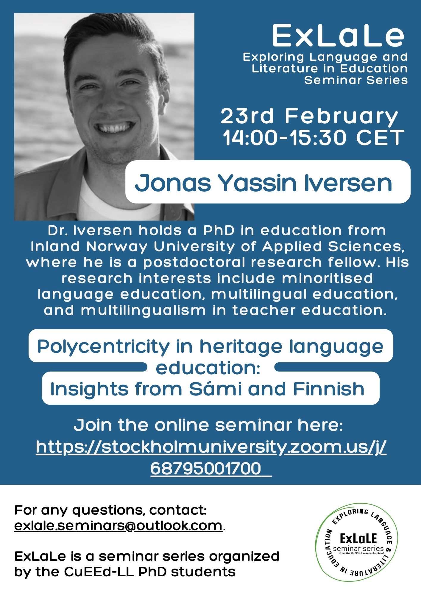 Presenting this topic is Dr. Jonas Yassin Iversen, who holds a PhD in education from Inland Norway University of Applied Sciences. He is currently a postdoctoral research fellow at the same institution. His research interests include minoritised language education, multilingual education, and multilingualism in teacher education. The seminar will discuss the following: