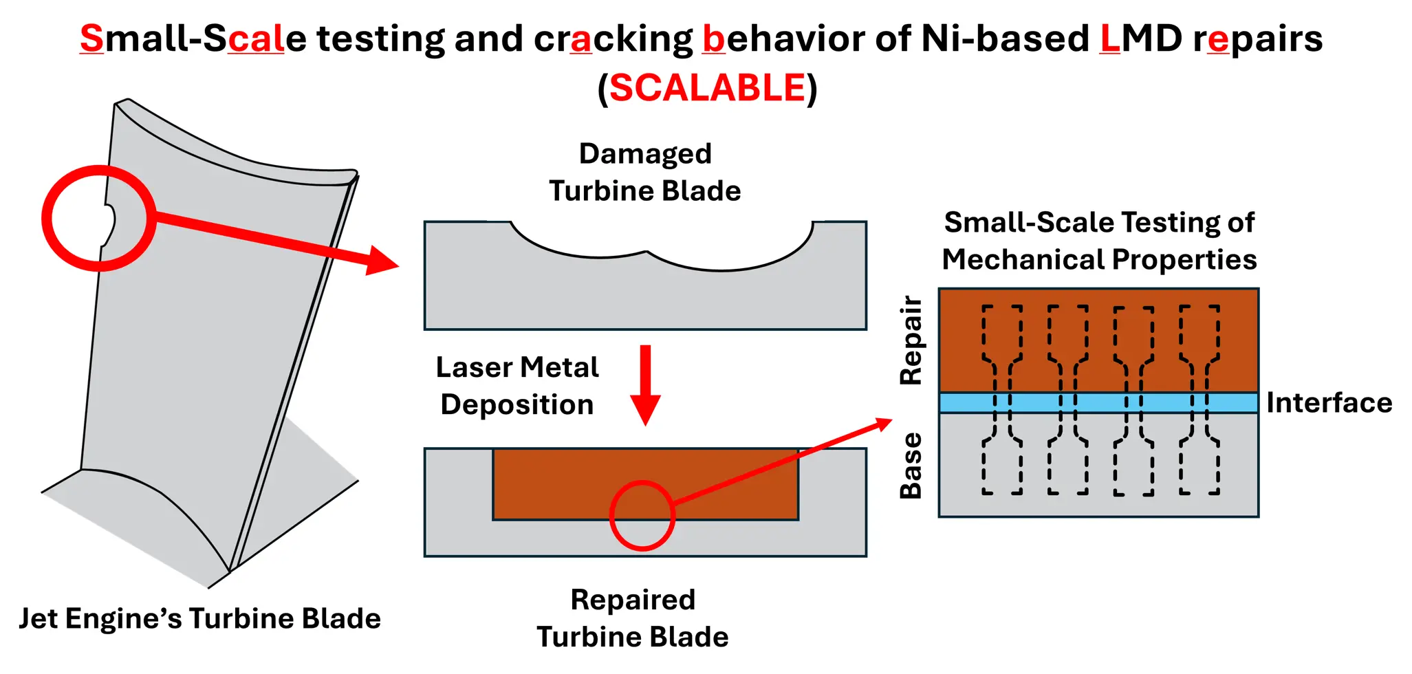 Nickel-based superalloys are widely used in aerospace engines, and a reliable repair of such components is important for reducing costs and downtime in the aerospace industry. With recent progress in additive manufacturing, methods like Laser Metal Deposition (LMD) offer new repair processing routes. In the SCALABLE project, we aim to evaluate the reliability of repairs made by LMD. We will use in-situ miniaturized tensile testing (MTT) and miniaturized low-cycle fatigue testing to study the effect of repair microstructure on the mechanical properties of repairs. Moreover, our aim is to utilize heat treatments as a way to improve the properties of the repaired components.